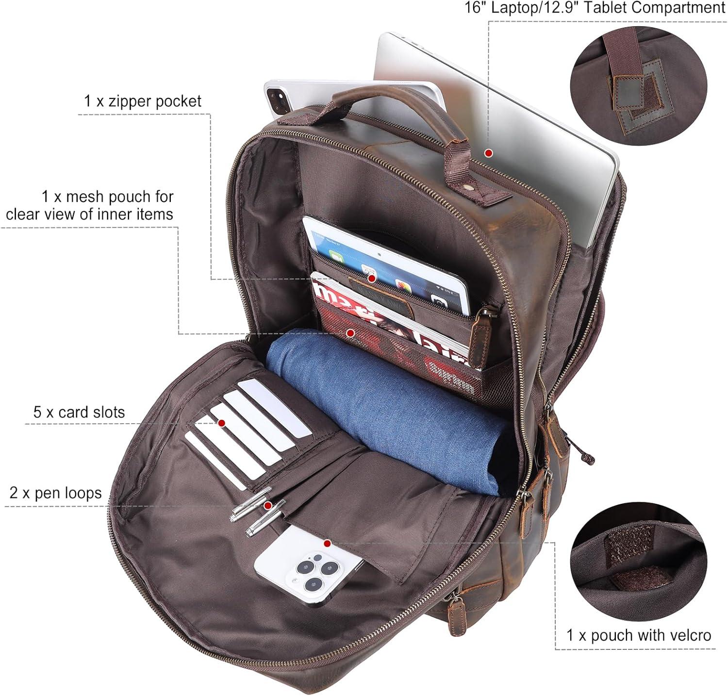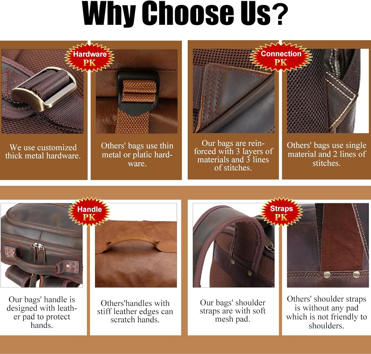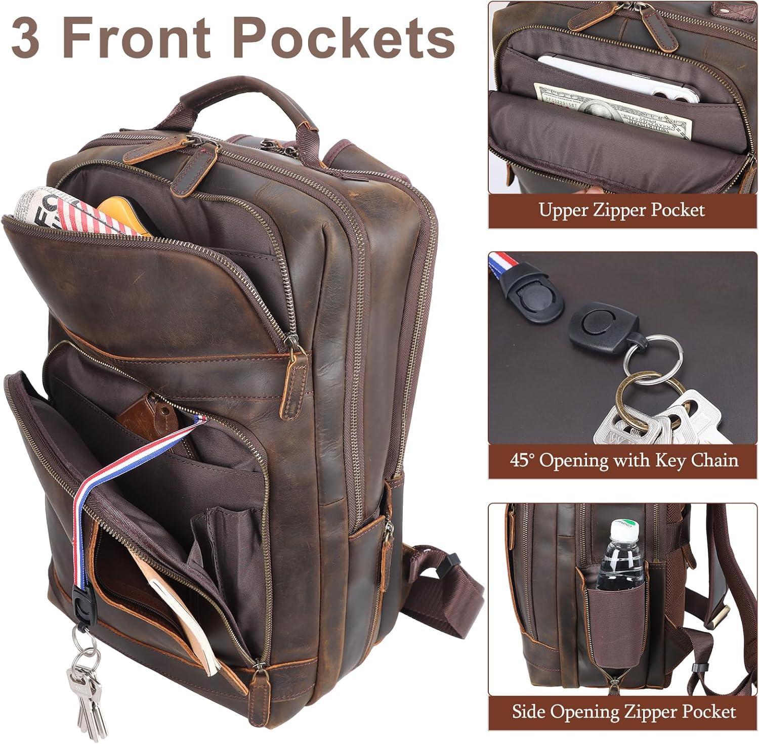 【Thick Material】The men's leather backpack is handcrafted of real full grain cowhide about 1.7mm thick, featured with its durability and natural texture of cow skin, thus each bag is unique. Being retro weathered look when it's new, the more you use the backpack,the shinier the leather will be.Ykk metal zippers and customized thick metal clip, reinforced metal rivets to ensure the leather laptop backpack to last long time.