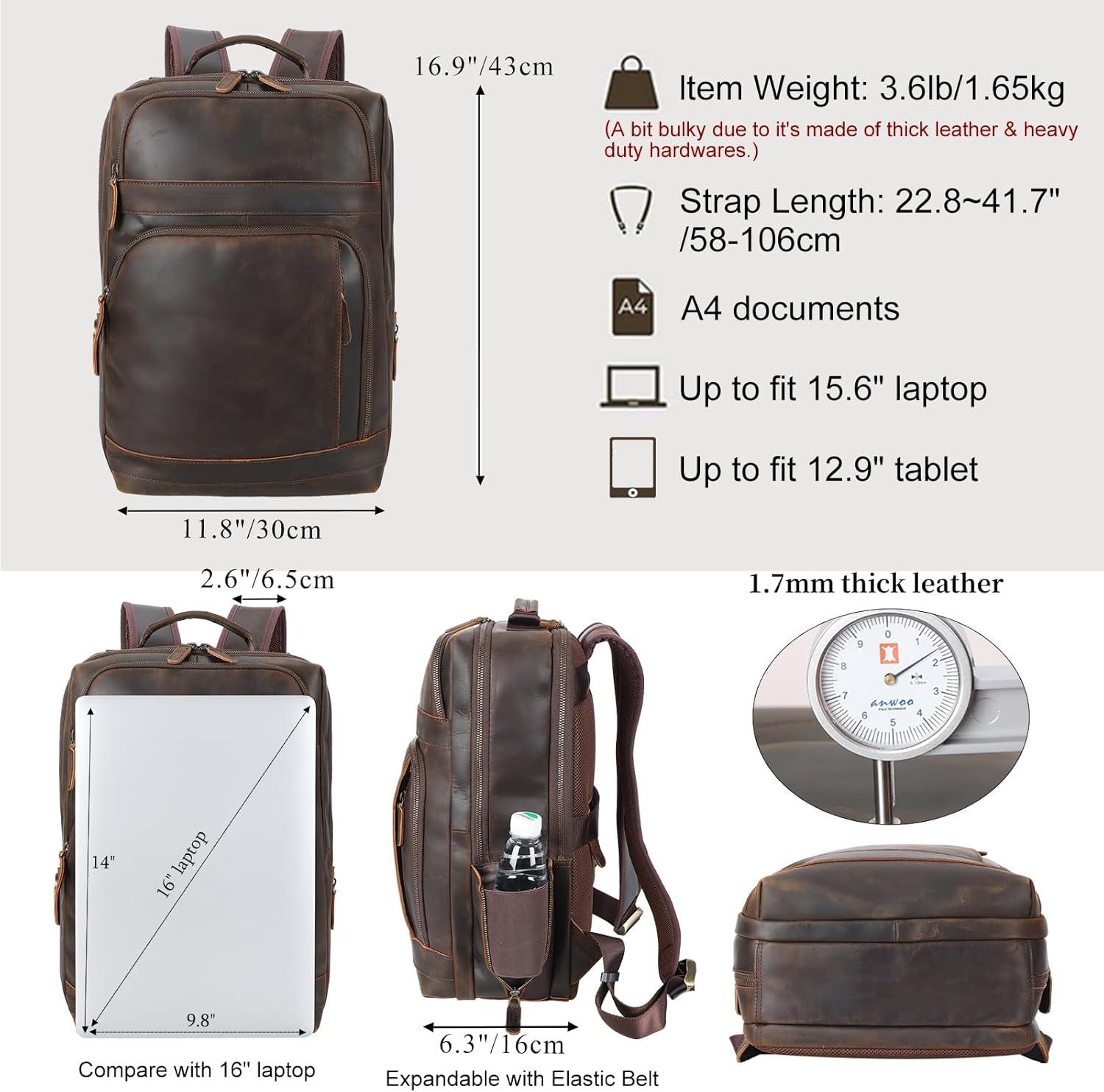 【Practical Large Backpack】Size:11.8″(L)x6.3″(W)x16.9″(H); weight: 3.6 lb (a bit bulky as its thick leather & hardware to withstand test of time); adjustable strap length: 22.8 – 41.7″; strap width:2.6″. The leather backpack bag for adult men suits for business travel, outdoor camping,casual city trip, or daily work commuting. It can be a men's laptop backpack, business travel backpack, weekender backpack for trip, carry on backpack for flight.