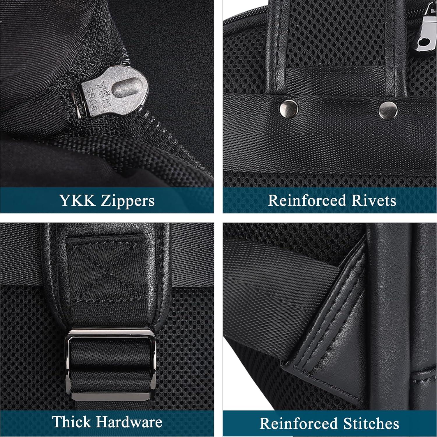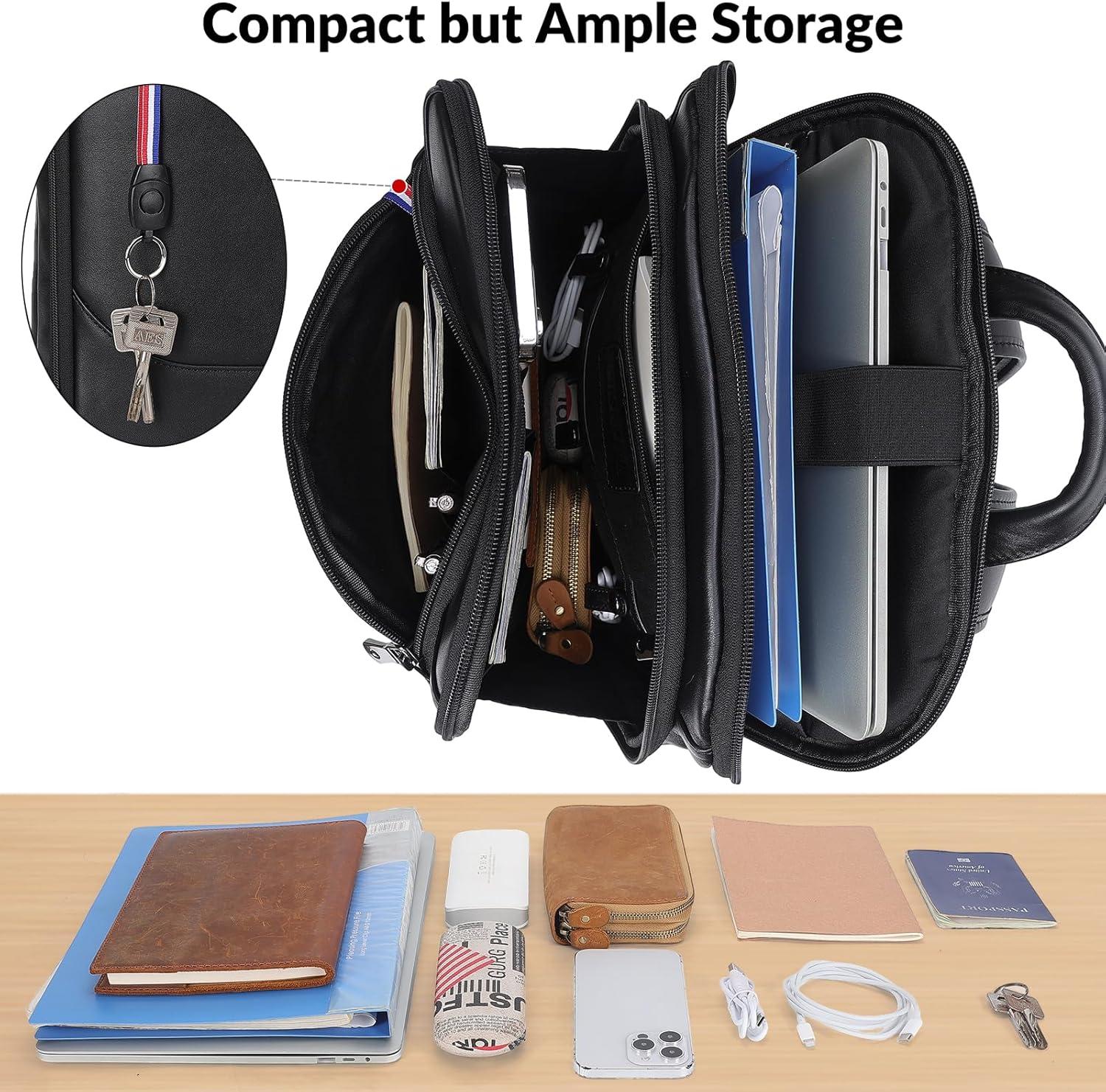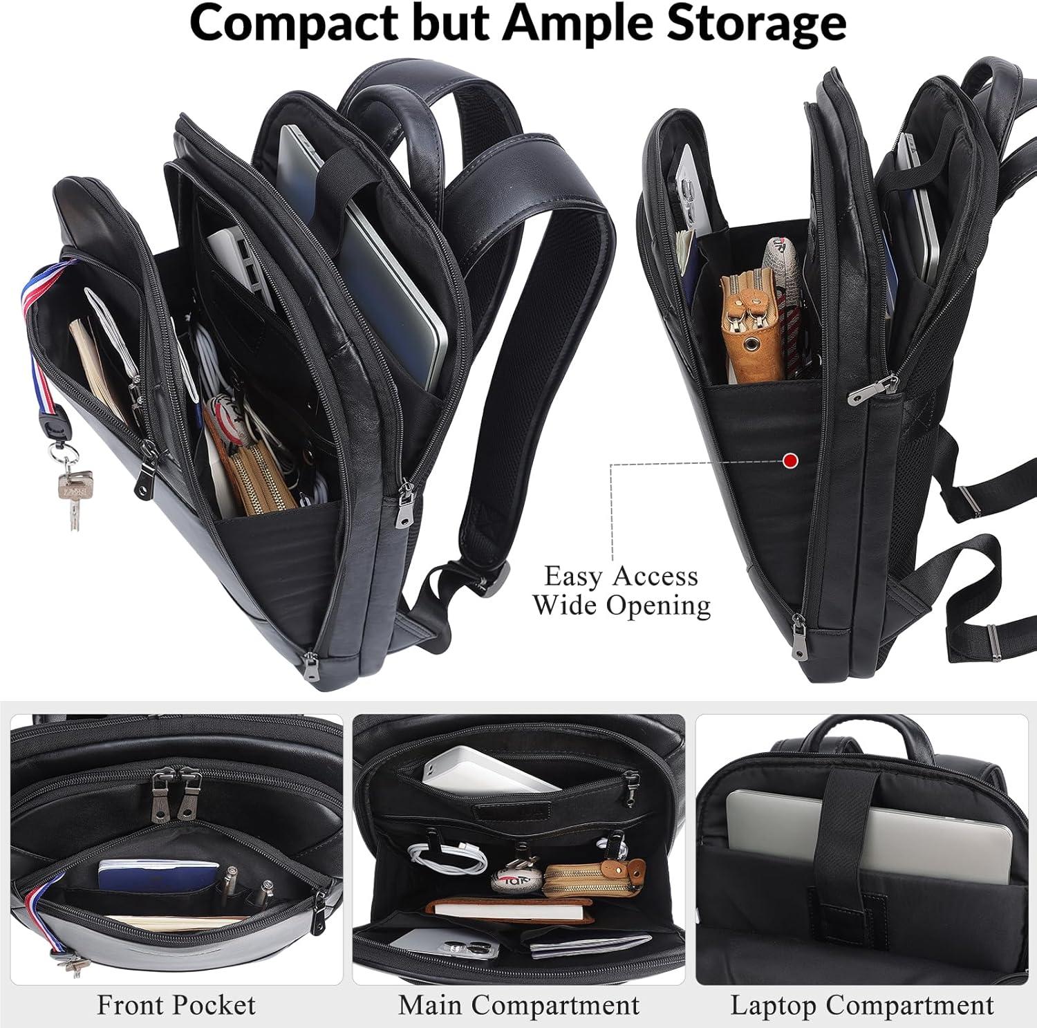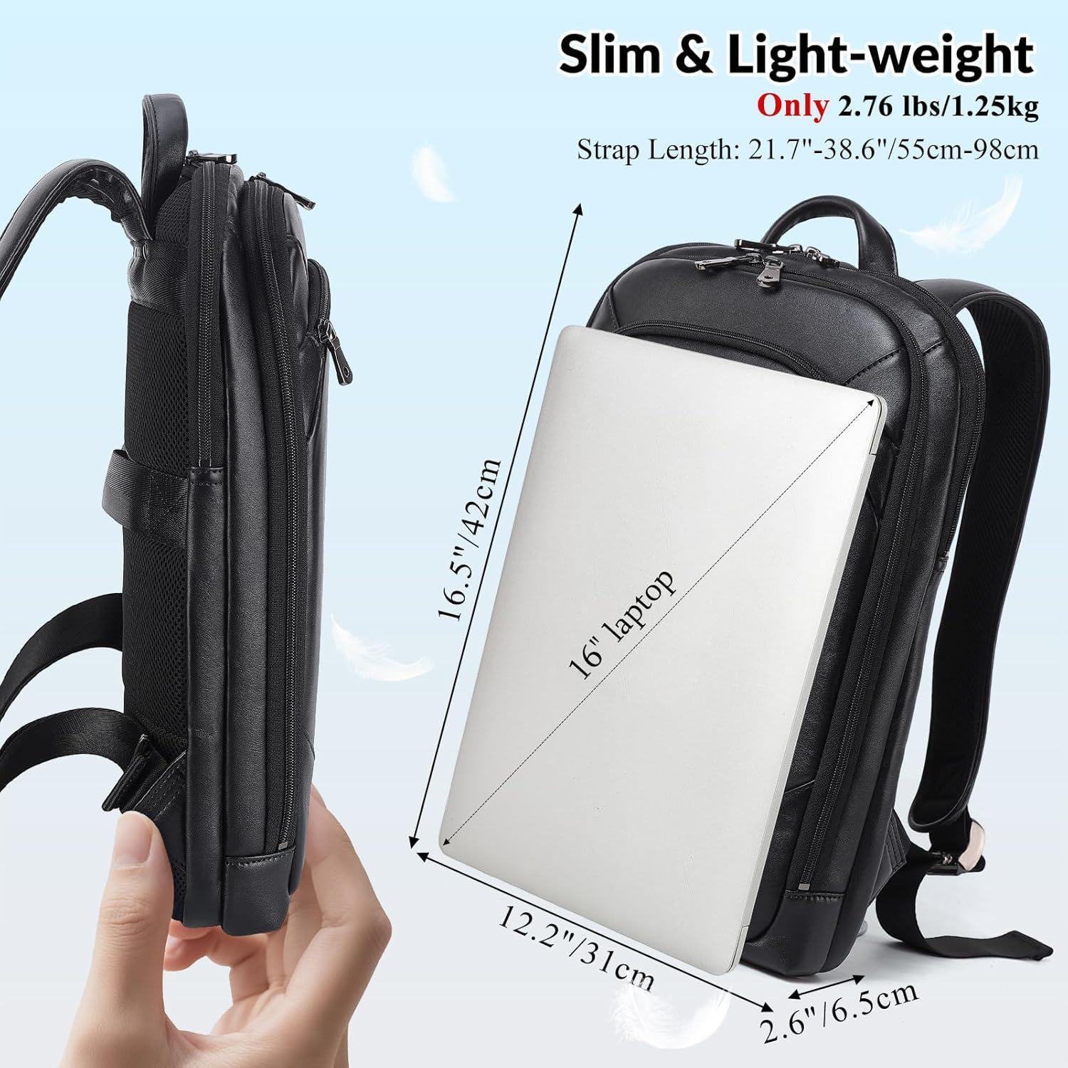 【Water-resistant & Secure Protection】The black laptop backpack is made of 1.2mm thick napa leather, crafted of real cowhide, sturdy to last over 10 years and has waterproof ability to withstand light rains and splashing water. The whole bag is padded with thick cushion, protecting your cherished 16” laptop and 12.6”tablet from damage of bump collision.