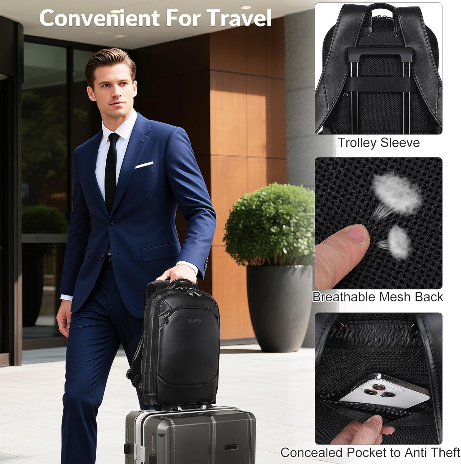 【Convenient Backpack For Travel】The slim leather business backpack has a luggage strap to hold itself on rolling suitcase,making easy trip. Its breathable mesh back panel and wide shoulder straps are load-distributing for comfortable carrying.