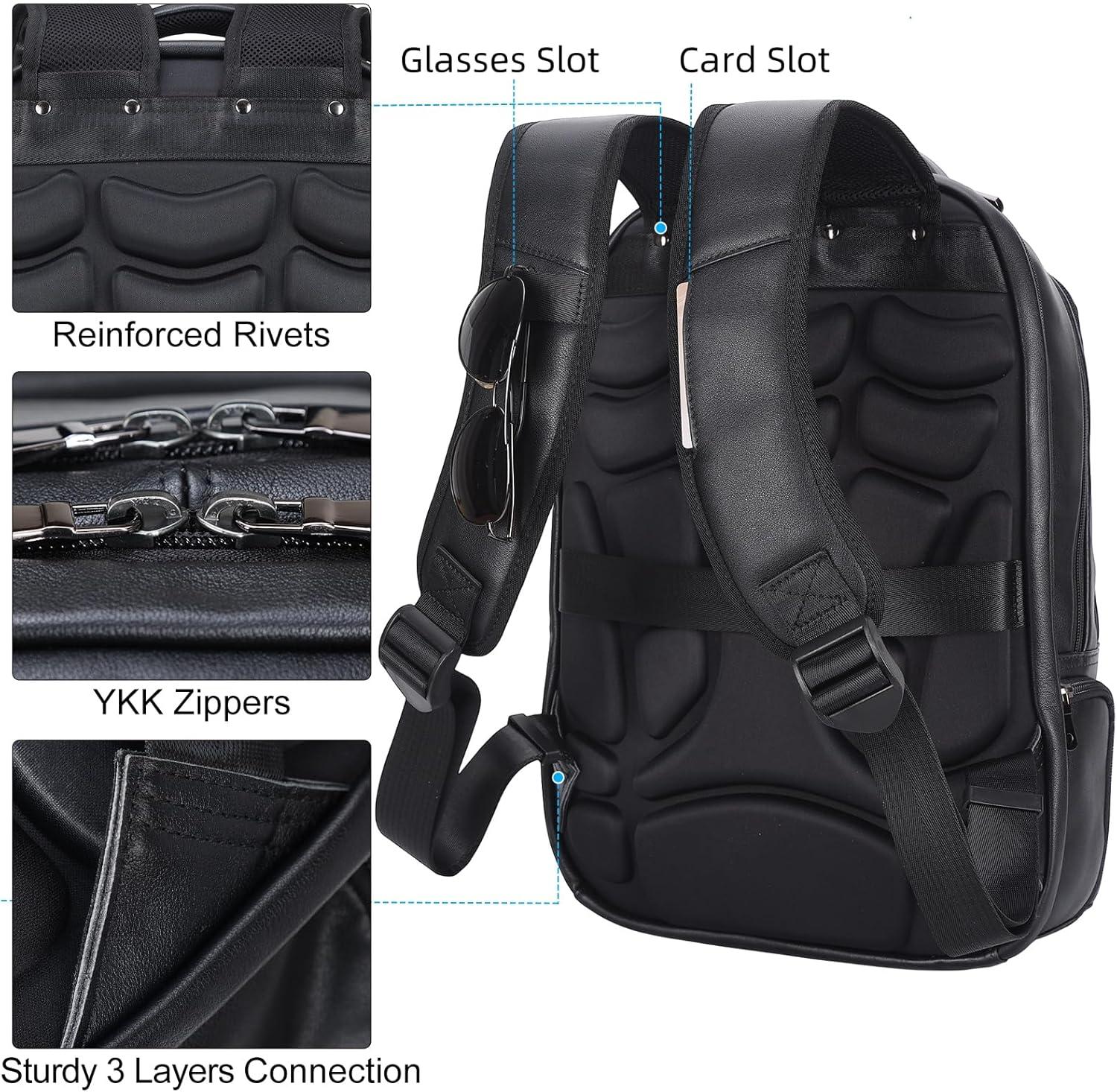 【Full Grain Leather and ykk Zippers】The travel backpack is crafted of 2mm thick full grain cowhide leather, processed with crazy horse tech, the backpack has a retro rough look. The leather grows brighter and shiny with age and also sturdy for decades. That's why many people become followers of crazy horse leather bag. ykk metal zippers is quite durable to bear multi times pull strength testing,no worry about zipper broken. Note: update version cancels usb port.