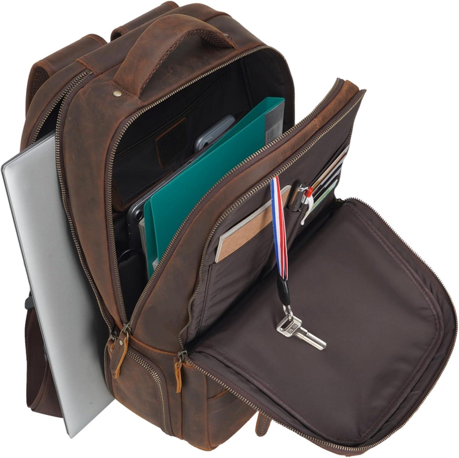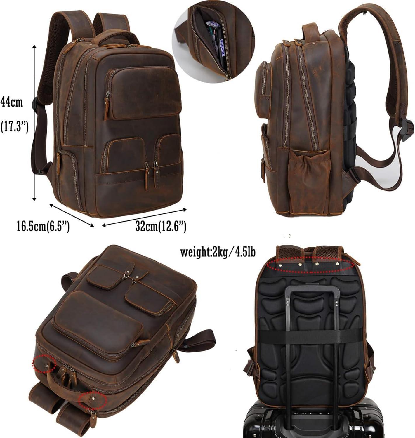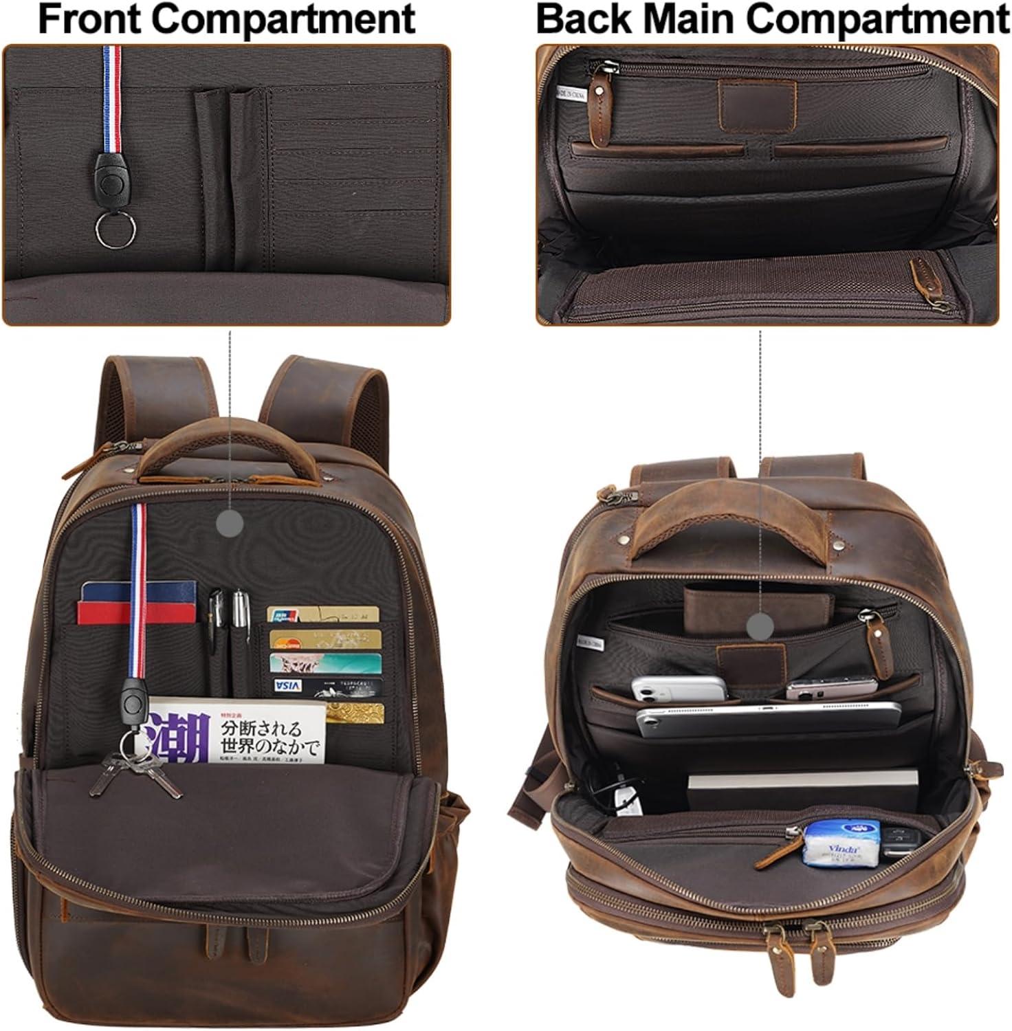 【Multi Purpose and Purchase with Confidence】The leather men's backpack is for business travel, outdoor hiking, camping, overnight trip. Large storage can accommodate 15.6 inch laptop, travel accessories, clothes, files, tablet, shaver, wallet, glasses case. One year quality commitment since you purchase the bag. If you have any issue with the product, please reach us for help.