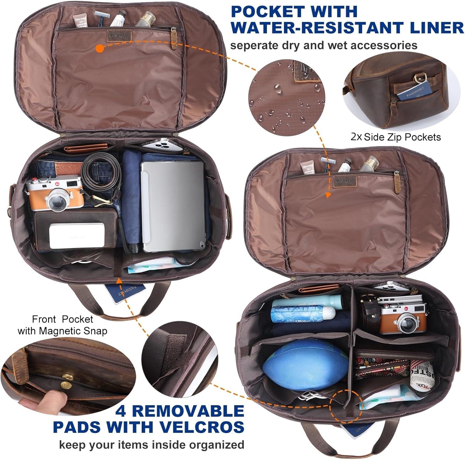 【Wet Pocket and Removable Dividers】The leather duffle bag for men is of humanity design with wet pocket to separate toiletries from dry items. 4 dividers with velcros are detachable, thus you adjust the dividers easily to meet your different storage needs and keep your items organized. Wide open main compartment with dual zipper sliders is for quick access to inner items and Tsa-friendly to pass airport checkpoint quickly for large airplanes.