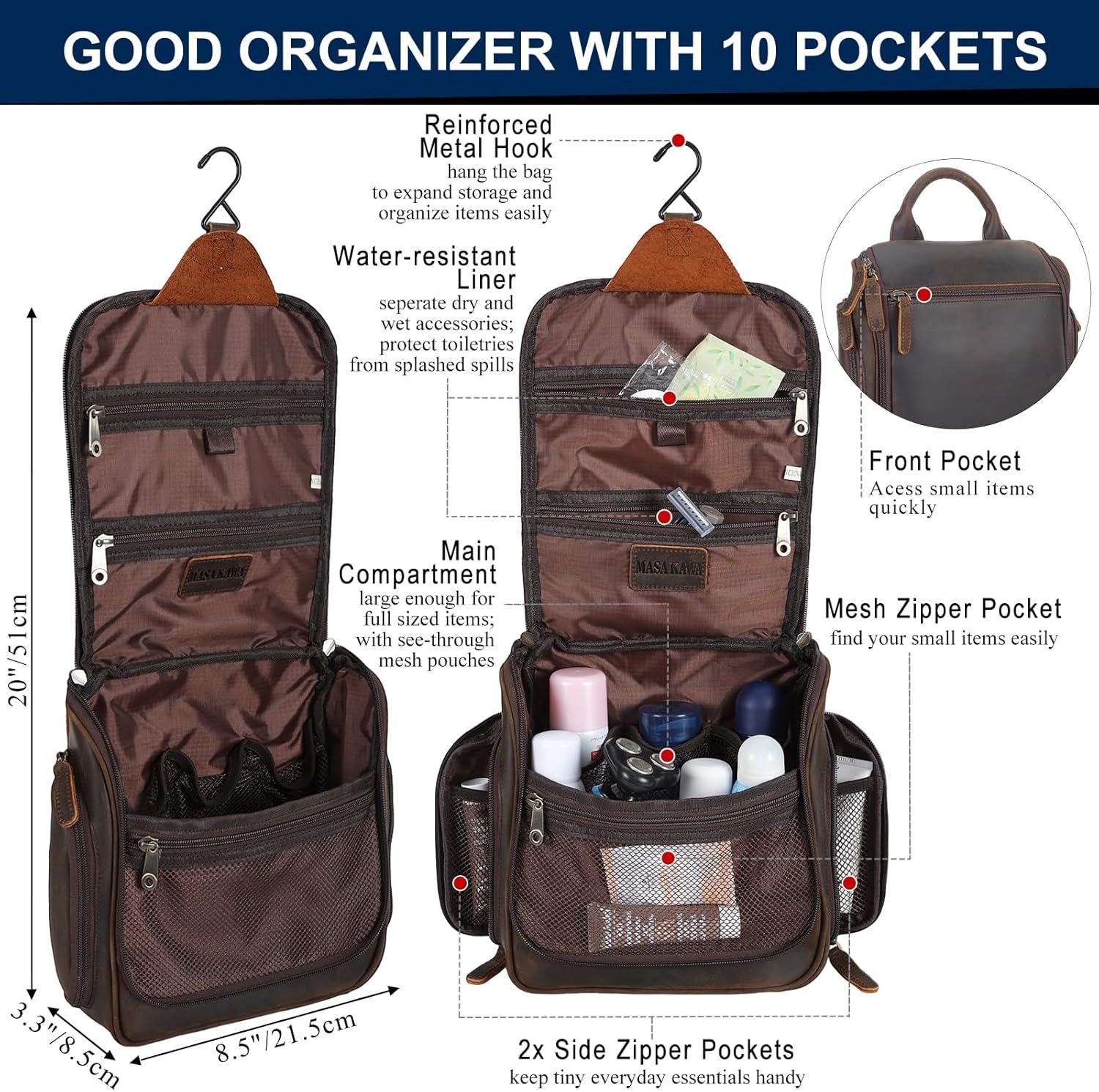 【Water-resistant Sturdy Materials】The black toiletry bag for men is crafted of 1.2mm thick cowhide napa leather, durable to last over 10 years and water resistant to withstand water splashing & light rains. It’s outfitted with ykk zippers and metal hook for long-lasting use of traveling; Water-resistant liner is easy to wipe clean, to separate dry and wet items, and to protect the toiletries from common bathroom splashed spills.