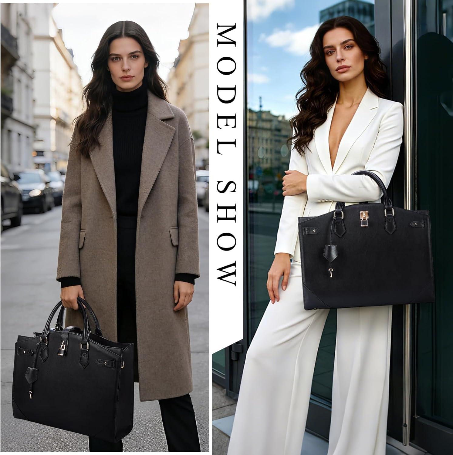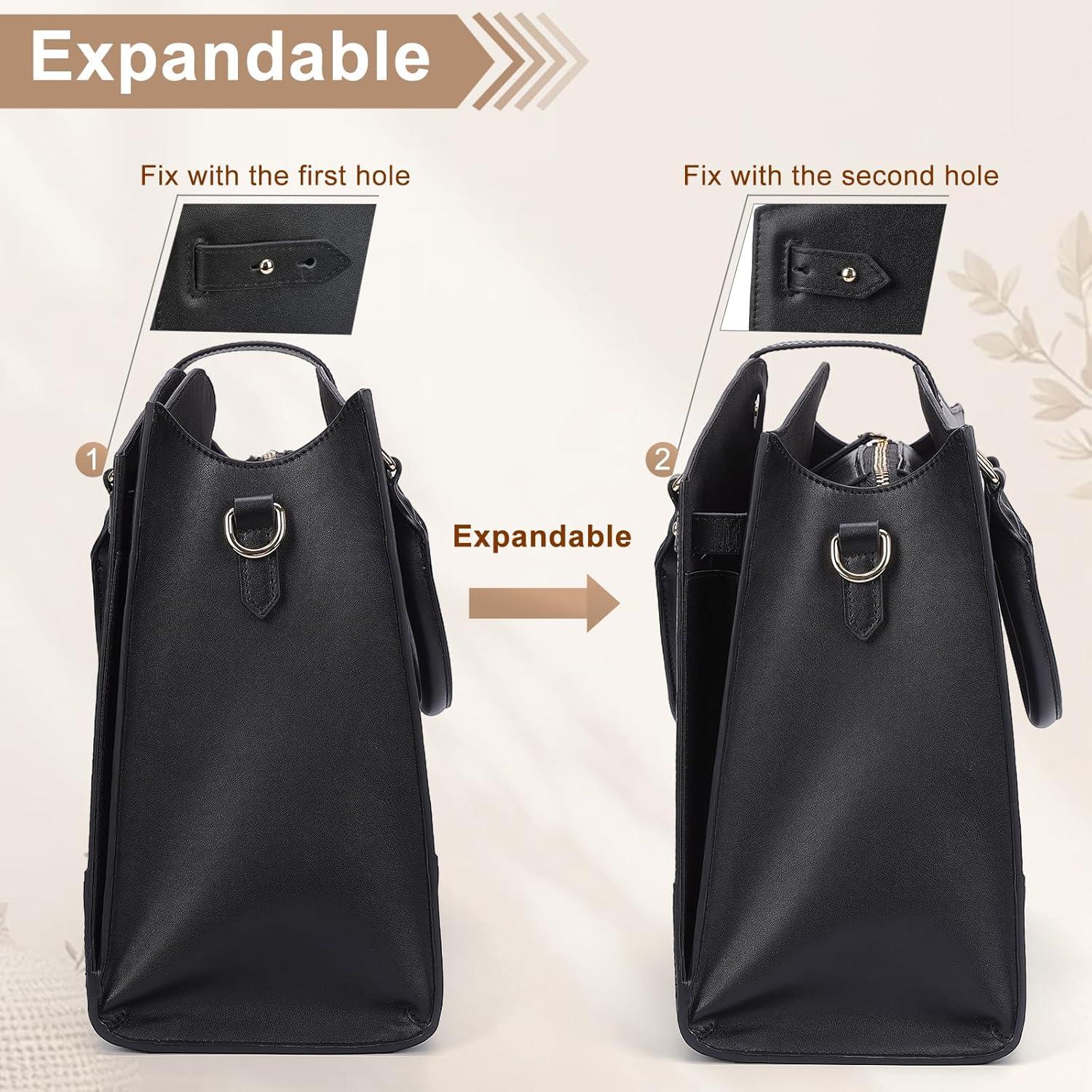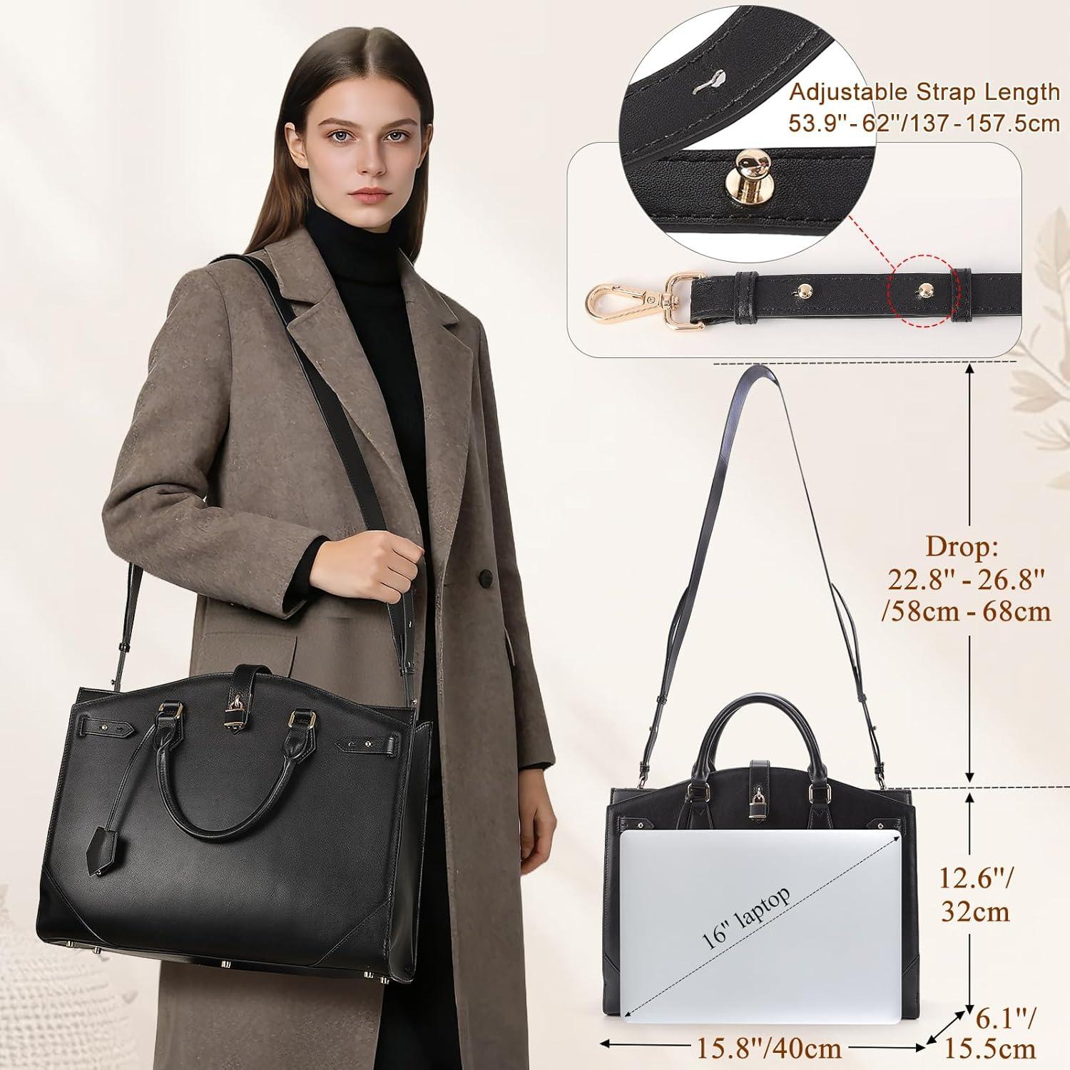 Masa Kawa Leather Work Laptop Tote Bag for Women, 16" Computer Shoulder Handbags, Expandable Anti-theft Business Briefcase Attache Case, Large Black | Waterproof, with Bottle Holder