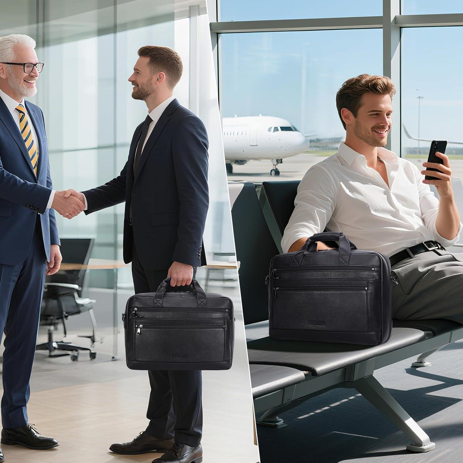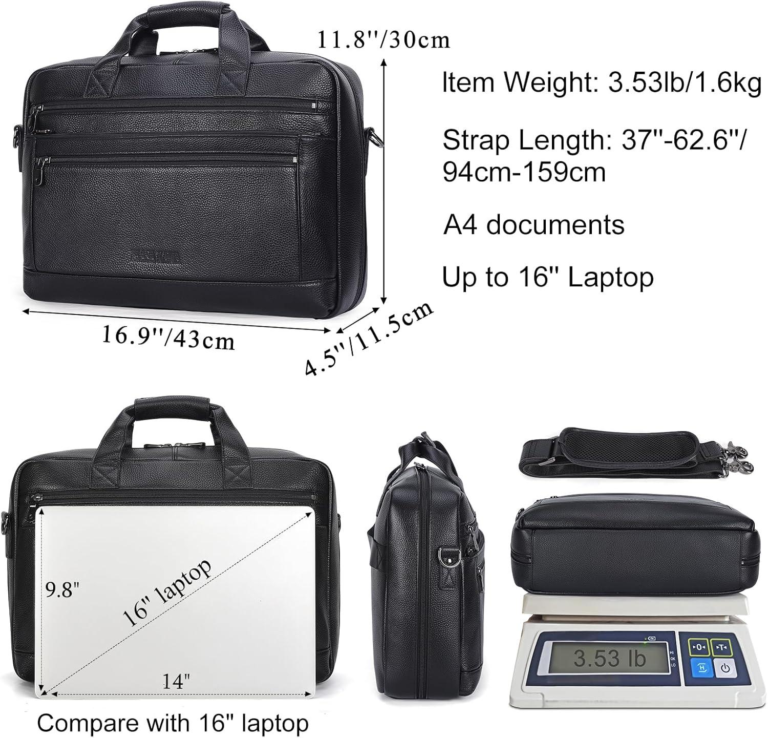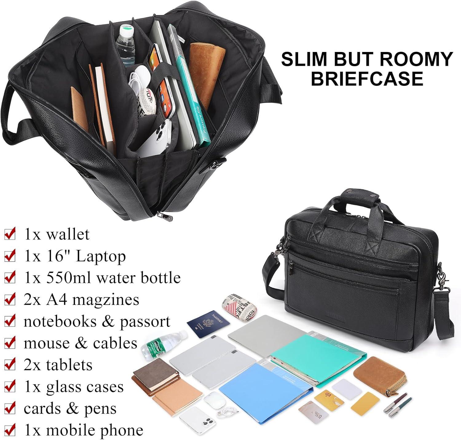 Masa Kawa Men’s Leather Briefcase for 16" Laptop Waterproof Crossbody Shoulder Messenger Bag Computer Attache Case for Business Travel Work, Black