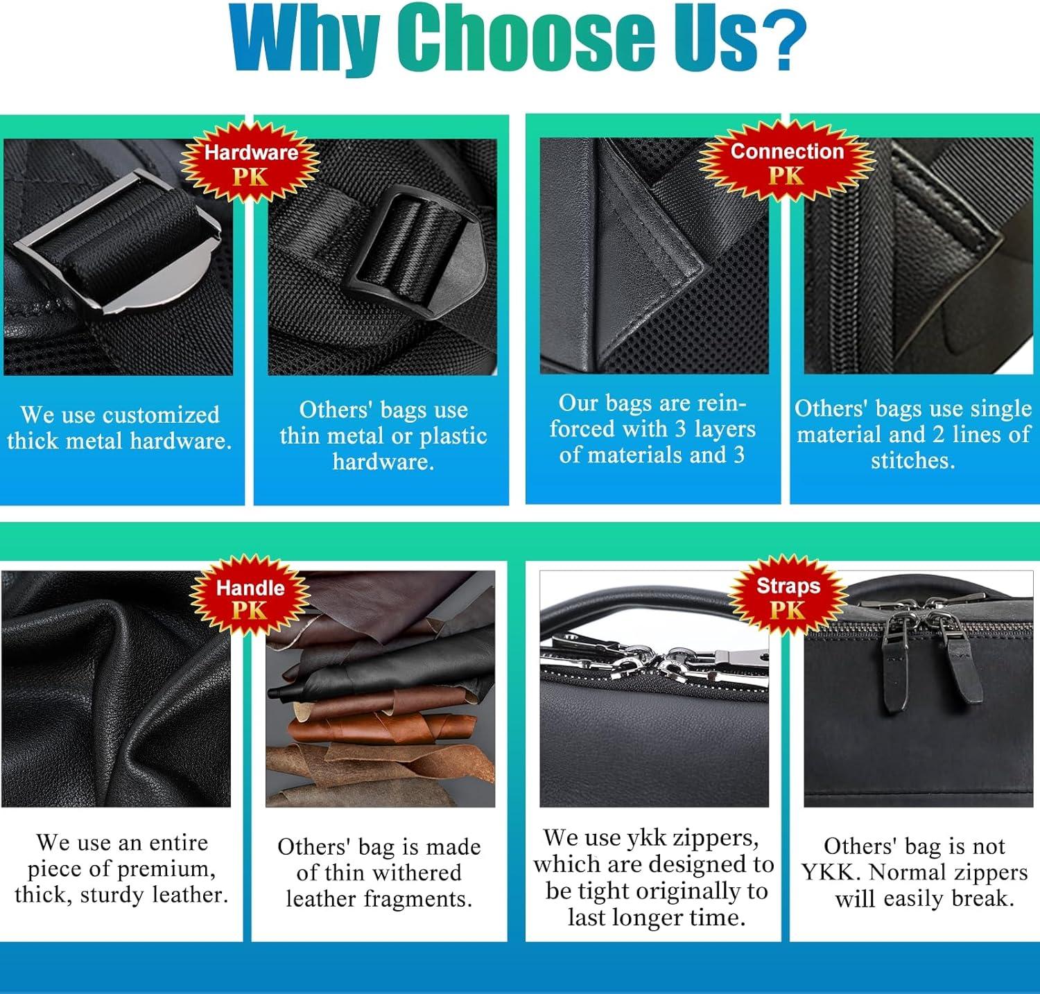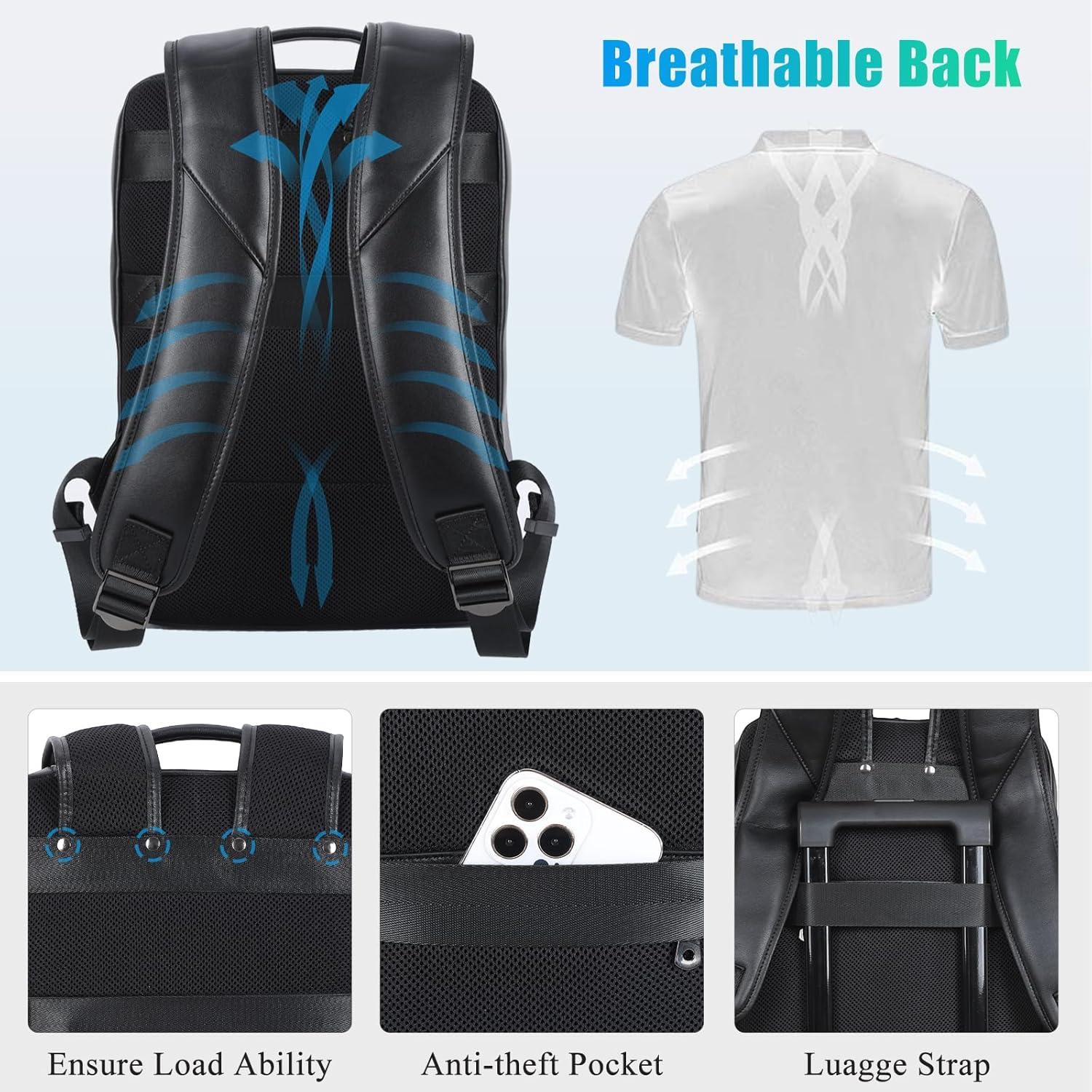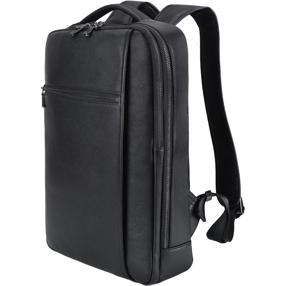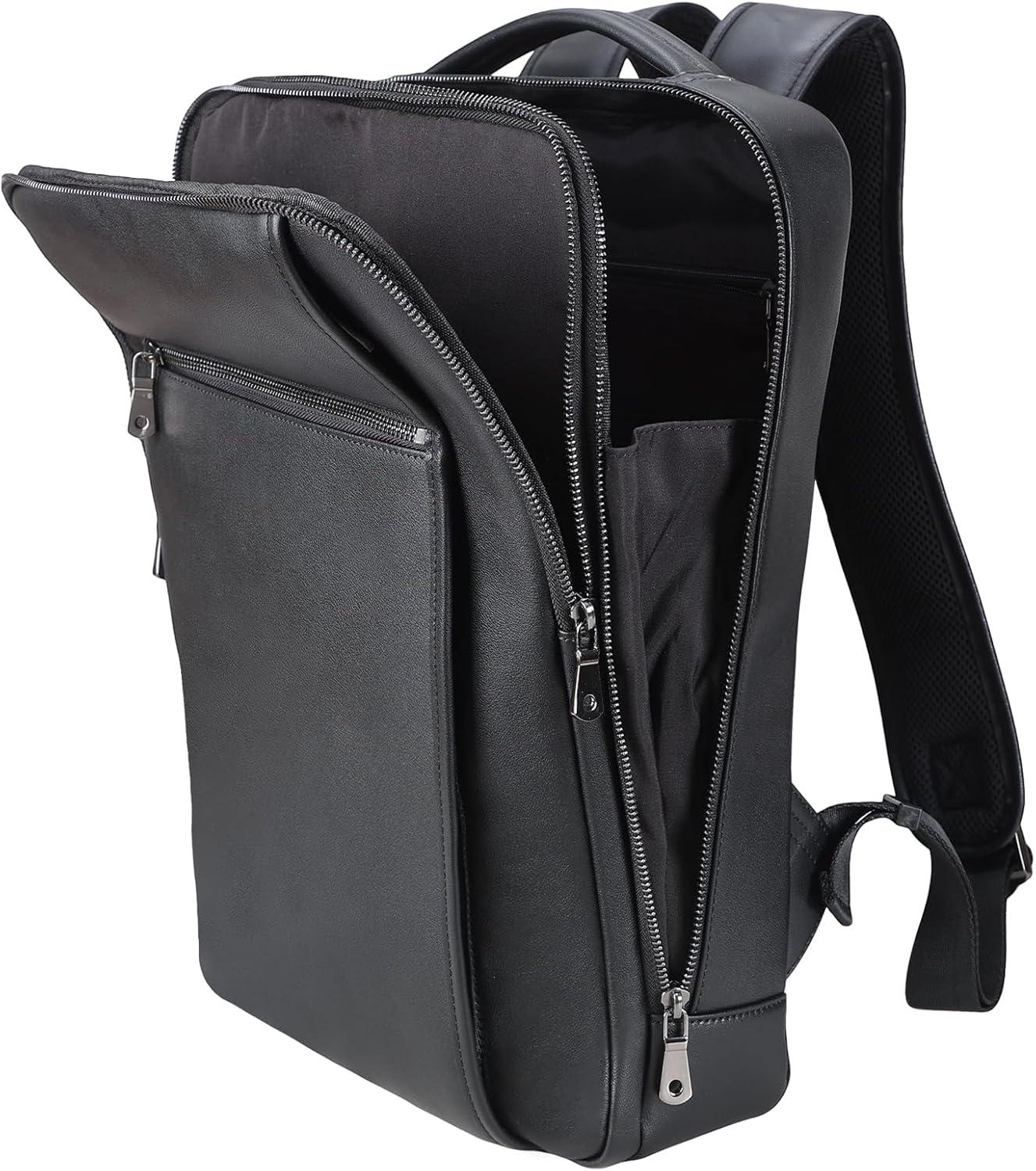 【Multipurpose Convenient Backpack】 A luggage belt across the back of the black leather bag to holding itself on rolling suitcase for easy travelling outdoor. Dual metal zipper sliders of main compartment is convenient for you to close and open the bag. The leather bag can be used as business laptop backpack, casual daily use daypack, weekend outdoor hiking bag, airplane carry on backpack, university college backpacks for unisex men and women.