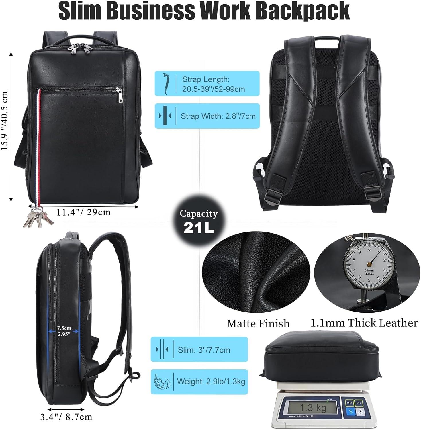 【Slim Business Laptop Backpack】The ultra thin leather backpack is for men and women. With padded laptop sleeve suitable for most of 15.6” laptops. The leather backpack is small and compact, but it’s good for daily commuting, office work , and business trip. Backpack size:11.4”(L)x3.4”(W)x15.9”(H); weight: 2.9lb/1.3kg; shoulder strap length:20.5-39”/52-99cm; strap width:2.8”/7cm.