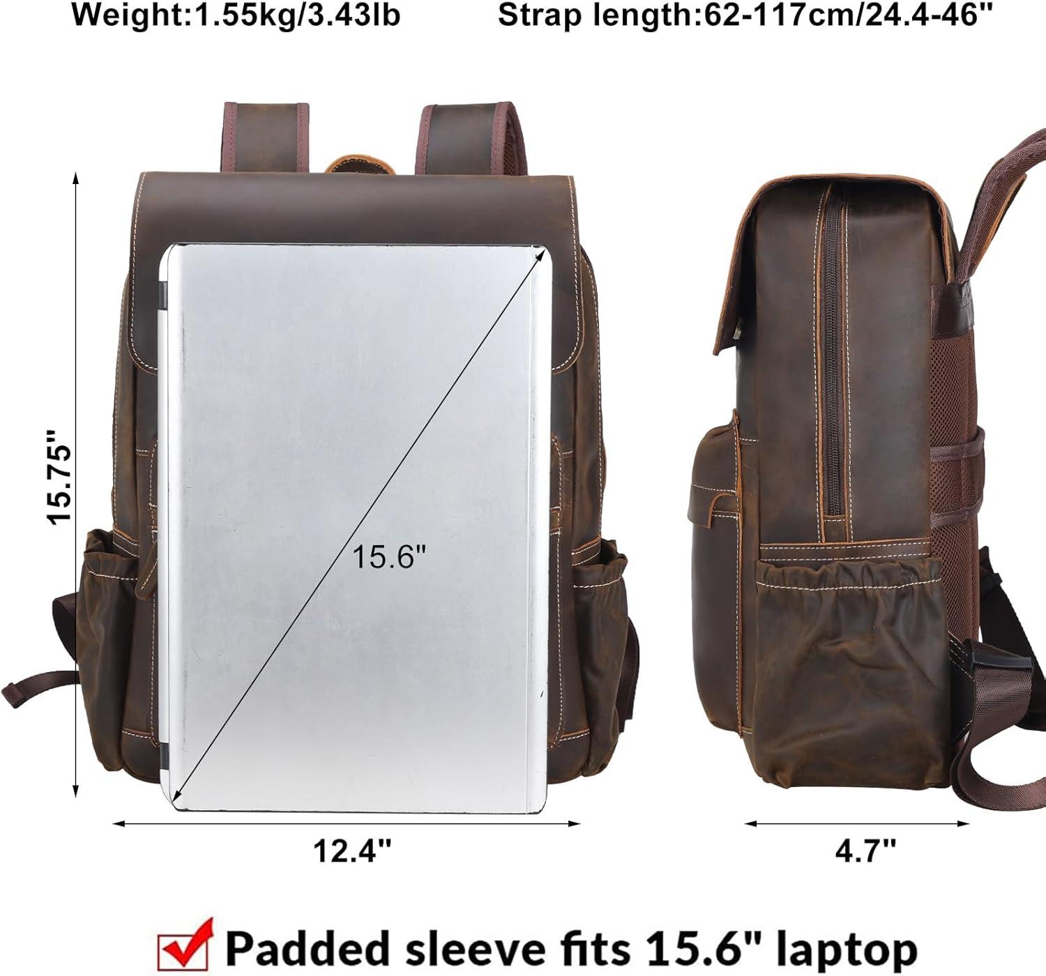 【Multi Purpose Backpack】The vintage leather backpack is a bit bulky because of thick quality leather. Suitable for commute, office work place, travel, business trip, outdoor sports, hiking, camping, cycling, biking and other occasions. It can be used as 15.6 inch computer laptop backpack, work backpack, travel rucksack backpack, daily daypack. His present choice for Christmas,Valentine's Day, Birthday, Anniversary,Ceremony,or Thanksgiving Day for adult him.