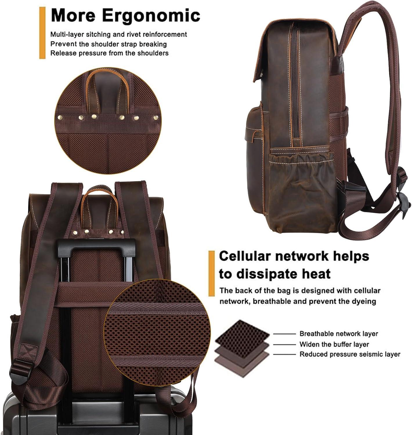 【Updated Design】The back of the brown leather travel rucksack is updated to breathable mesh padding, which is comfortable to carry and also can avoid clothes staining. A luggage belt is added to allow you to put the daypack safely on your suitcase so that you can travel easier. Updated adjustable shoulder straps can be shorten and lengthen according to your height and body type freely.