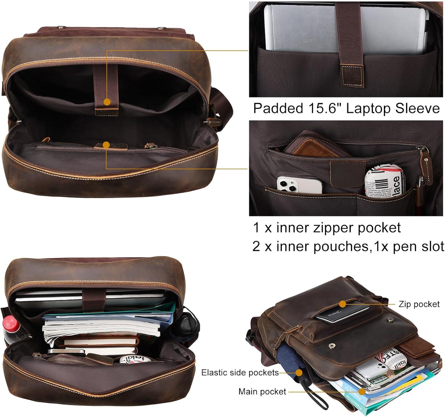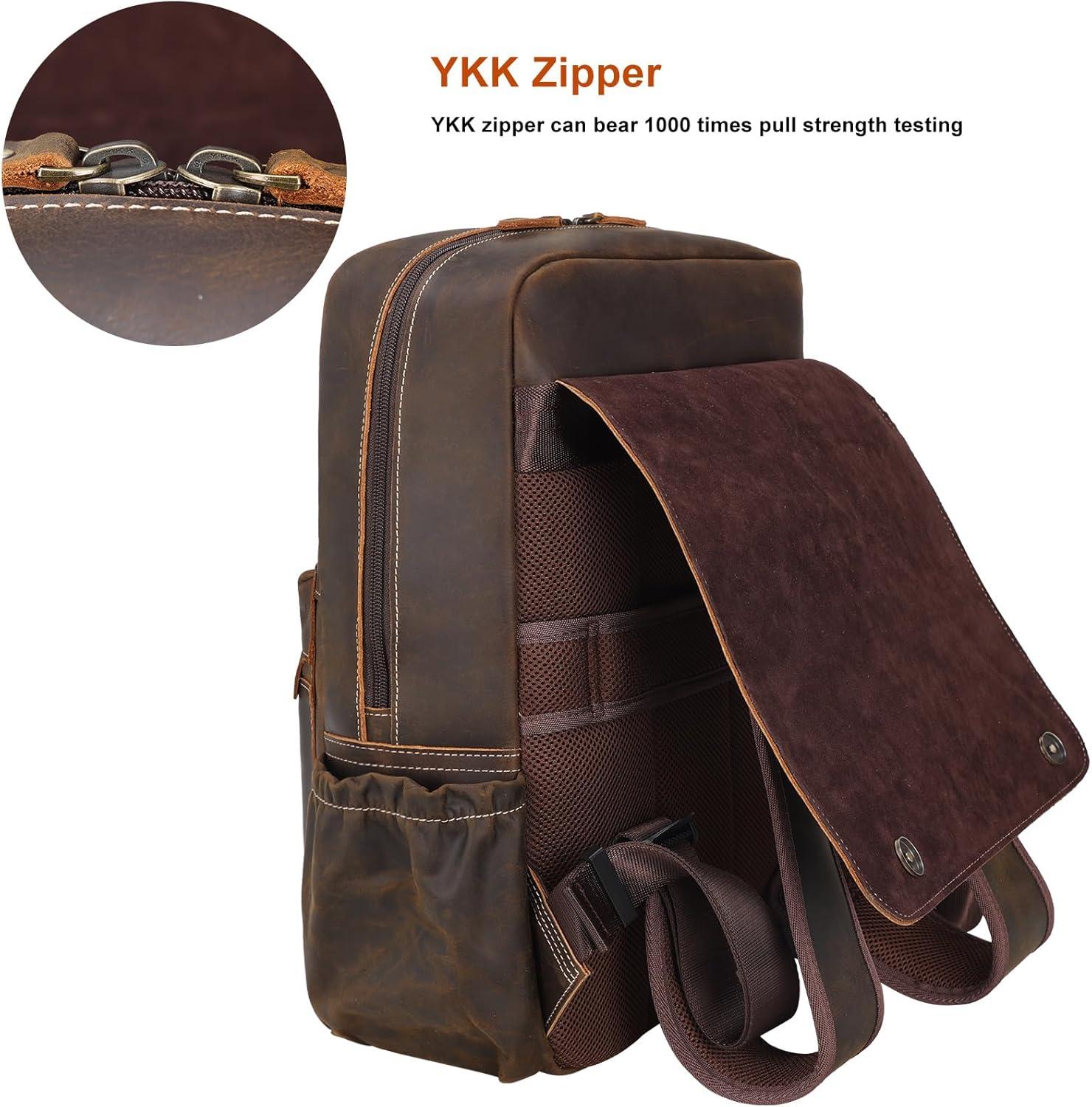 【High Quality】The leather laptop backpack for men is made of 1.8mm thick genuine full grain leather, which has a retro rough look at first, but grows brighter and shiny with age amazingly, durable and sturdy for decades. The backpack is updated to premium ykk zippers,which can bear multi times pull strength test, no worry about zipper broken. Heavy duty hardware, flap design with magnetic closure, sturdy lining ensures durability.